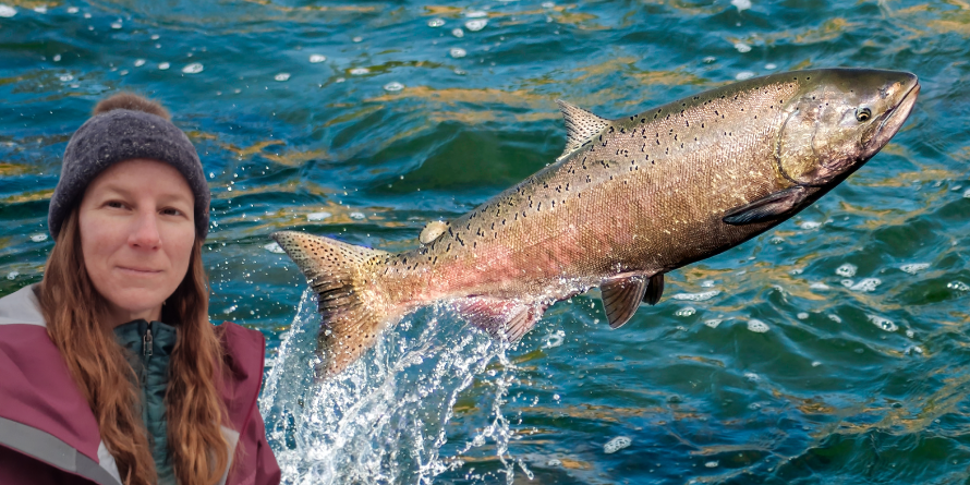 Kathryn's headshot alongside a salmon jumping out of the water.